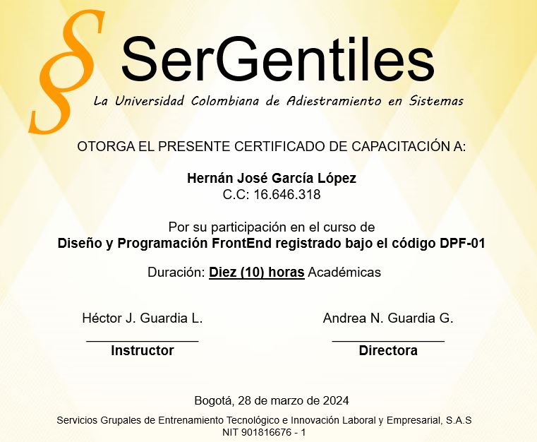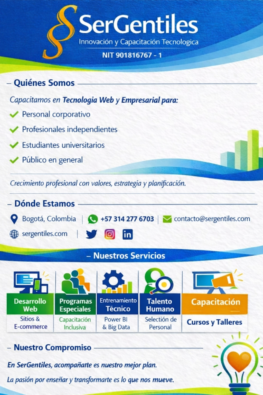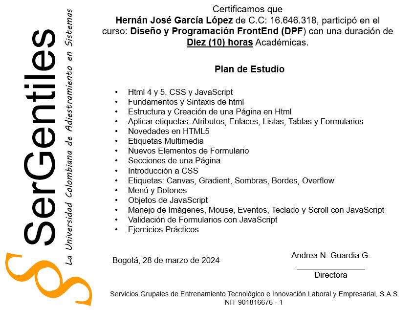 Contenido: Html 4 y 5, CSS y JavaScript. Creación de Landing Page, Fundamentos y Sintaxis de html, Estructura y Creación de una Página en Html, Aplicar etiquetas: Atributos, Enlaces, Listas, Tablas y Formularios, Novedades en HTML5, Etiquetas Multimedia, Nuevos Elementos de Formulario, Secciones de una Página, Introducción a CSS, Etiquetas: Canvas, Gradient, Sombras, Bordes, Overflow, Animaciones, Transiciones y Transformaciones, Menú y Botones, Objetos de JavaScript, Manejo de Imagénes, Mouse, Eventos, Teclado y Scroll con JavaScript, Validación de Formularios con JavaScript, Introducción a la IA, ChatGPT, MSCopilot, Google Gemini, Ejercicios Prácticos y Aplicación.